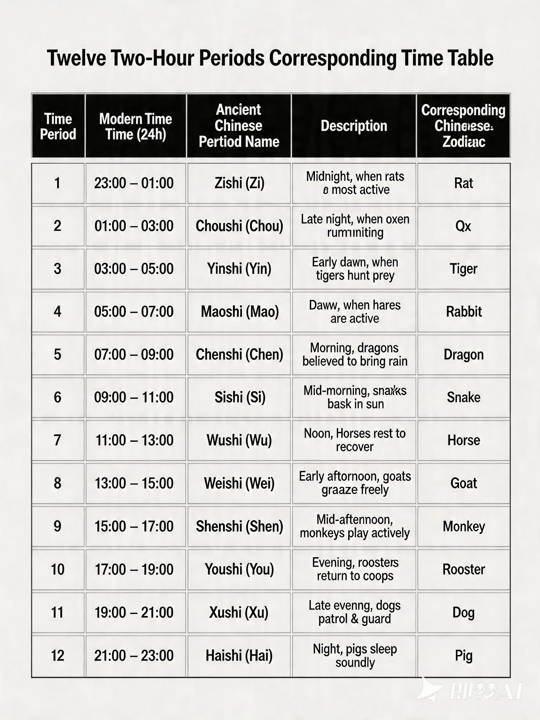 1. 11:00 PM – 12:59 AM (Hour of Zi)